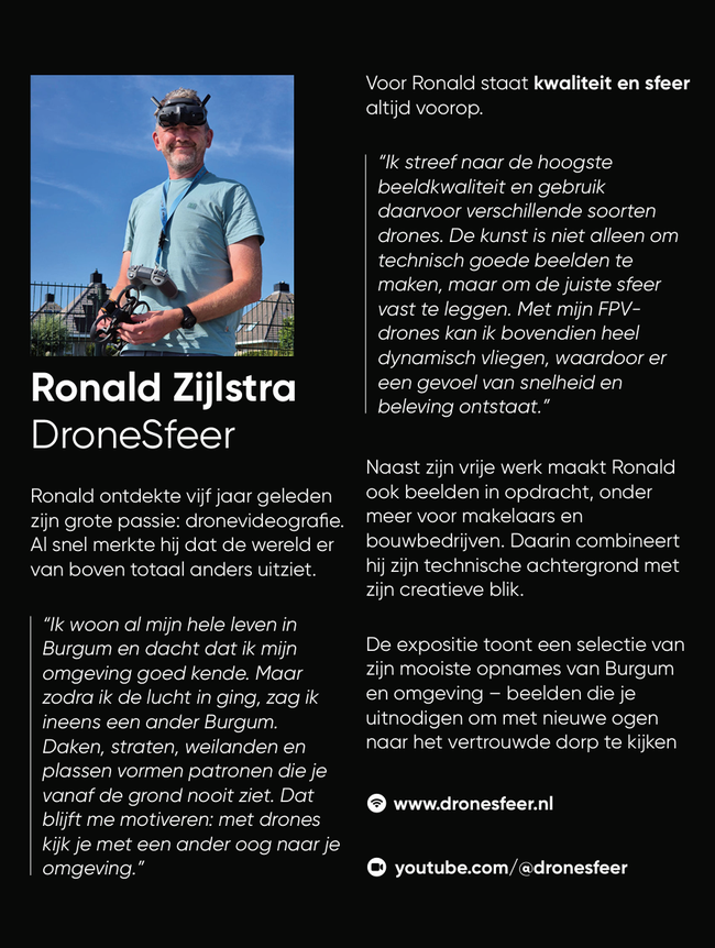 Ronald Zijlstra is in het dagelijks leven ondernemer bij OkéPC IT, onder meer bekend van de gelijknamige computerwinkel in Burgum. Zijn werk met drones begon als hobby, maar intussen wordt hij door opdrachtgevers gevraagd om unieke, dynamische en sfeervolle beelden vast te leggen.
